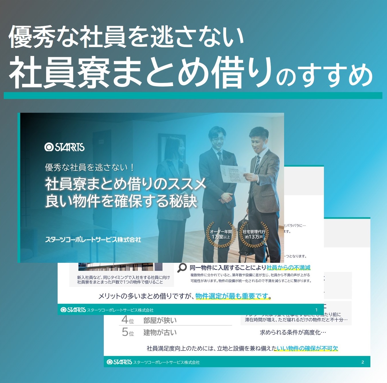 「社員寮まとめ借りのすすめ 良い物件を確保する秘訣」に関する資料をご確認いただけます。